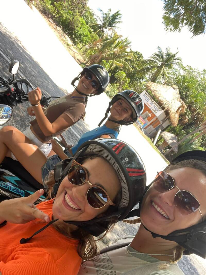 Wir haben uns entschieden, zwei Roller zu viert auszuleihen und nach Mazunte zu fahren. Auf der Suche nach einem guten Roller-Verleih haben wir uns schließlich für einen entschieden. Was man natürlich machen musste, war, einen Ausweis vorzulegen, den Roller zu bezahlen, eine Kaution zu hinterlegen und Papiere zu unterschreiben. Na gut, als das erledigt war, ging es los. Da Letizia mehr Erfahrung im Fahren hatte, fuhr sie mit Meli vor. Josi und ich fuhren etwas langsamer, da es hier sehr viele Topes (Bremsschwellen) gibt. Bei unserem ersten Halt hat Josi sich den Finger etwas eingeklemmt, und er hat etwas geblutet. Leider konnte sie ihr eigenes Blut nicht ertragen, und ihr wurde ein wenig schlecht. Also haben wir ein Foto für Meli gemacht, weil sie noch meinte, wir sollen keinen Unfall bauen.